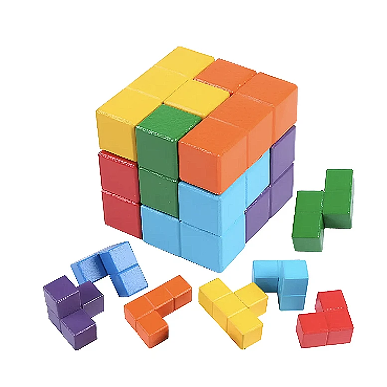 Cubo de madera que consta de 7 piezas en 3D, tanto para armar el cubo como para armar muchas otras estructuras también en 3D. Medidas: Largo 6 cms, Ancho 6 cms, Alto 6 cms.