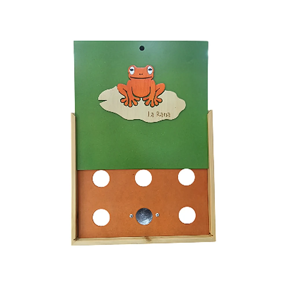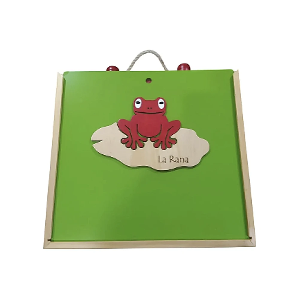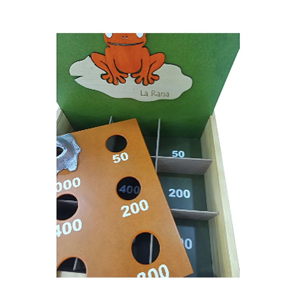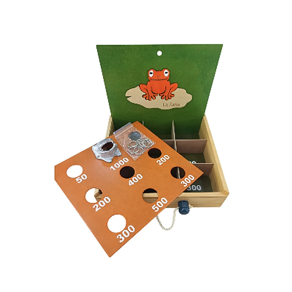 Juego de rana clásico con marco de MADERA, la tabla del fondo sirve como tapa y trae una agarradera artesanal de fique reforzada para llevar a cualquier lado como un maletín. Incluye 6 argollas. El acabado es en tintes vegetales a base de agua y laca catalizada. En la tapa lleva un hermoso aplique también de madera, lo que le dá un toque único y exclusivo El producto es totalmente artesanal elaborado por manos colombianas. Medidas Cerrado: Lar 36 cms, Anch 36 cms, Alt 9 cms. Te esperamos!!!
